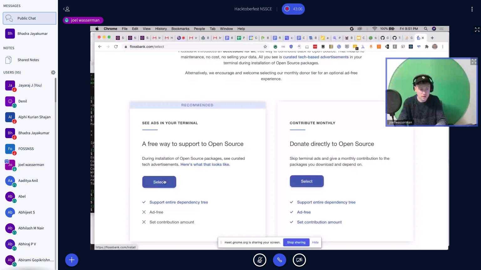 It was the start of Hacktoberfest and this was the first session hosted by FOSSNSS, Journey to Open Source with Joel. It was indeed a great pleasure to attend a session taken by Mr. Joel Wasserman, the creator of FLOSSBANK.com and software engineer at Google. He is a well known face in the world of FOSS and is the creator of FLOSSBANK which provides free and frictionless way to support all open source maintainers across entire dependency of installed packages. He was an active member of the community and have been working in Google for the past 2 years. He is also the Director at the Teacher's Fund, an organistion which aims at making public teaching a more desirable career path.