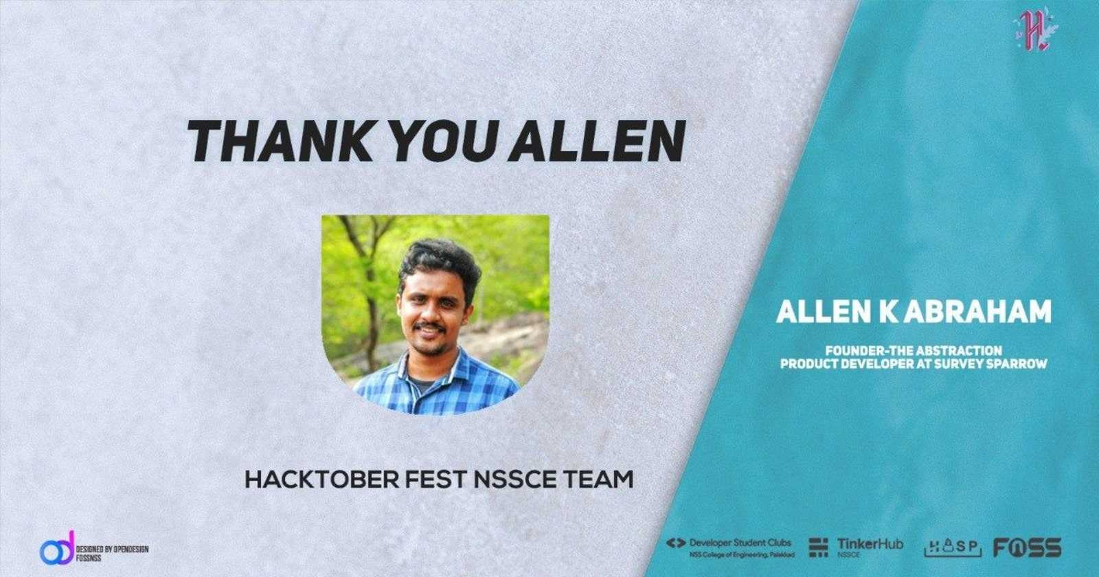 FOSSNSS, TinkerHub and HackerSpace of NSSCE collaborately conducted the session "Without Opensource" in connection with Hackoberfest. This was the second session in the series of talks. The session was handled by our alumni Mr.Allen K Abraham, founder of "The Abstraction". This is an initiative which involves the sharing of coding resources in Malayalam free of cost. Mr. Allen is also a product developer in Survey Sparrow.